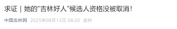 8月13日,据中国吉林网报道,所有的候选人都是基层推荐上来的,齐某的“吉林好人”候选人资格没被取消。记者在采访中得知,在推荐齐某过程中,评选组织单位征求了相关部门的意见,并进行了资格审查,同时,也组织专人到其工作单位、家,并对她的领导、同事、朋友进行走访核实,其事迹材料符合“身边好人”选树宣传活动精神。