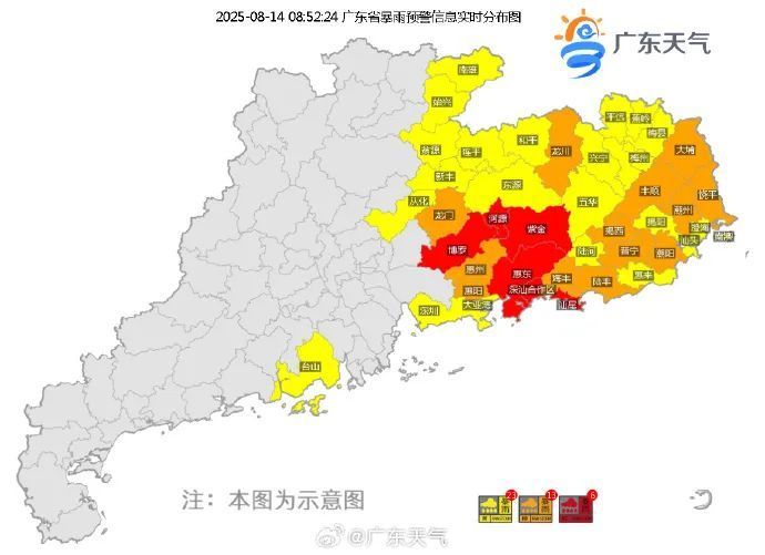 博罗、河源、紫金、惠东、深汕合作区、汕尾暴雨红色预警生效中,惠州、饶平、海丰等13个市县暴雨橙色预警生效中,深圳、始兴、平远等23个市县暴雨黄色预警生效中;