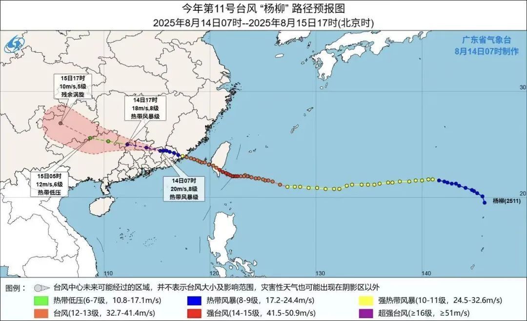 据@广东天气 ,8月14日09时,今年第11号台风“杨柳”(热带风暴级),中心位于北纬24点5度,东经114点9度,也就是位于广东省河源市境内,中心附近最大风力8级,达到20米每秒的风速,中心最低气压999百帕。预计,“杨柳”将以每小时30-35公里的速度向偏西移动,强度逐渐减弱。