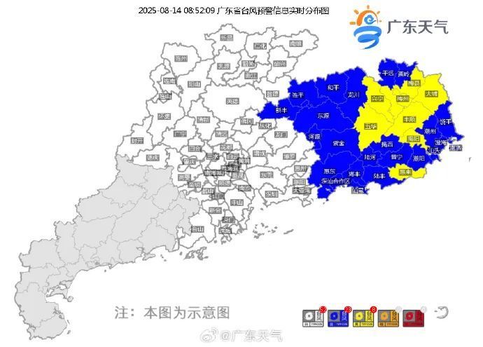 截至8时52分,惠来、揭阳、五华、丰顺、兴宁、梅州、梅县、大埔台风黄色预警生效,惠东、新丰、潮州等23个市县台风蓝色预警生效,广州、深圳、英德等52个市县台风白色预警生效;