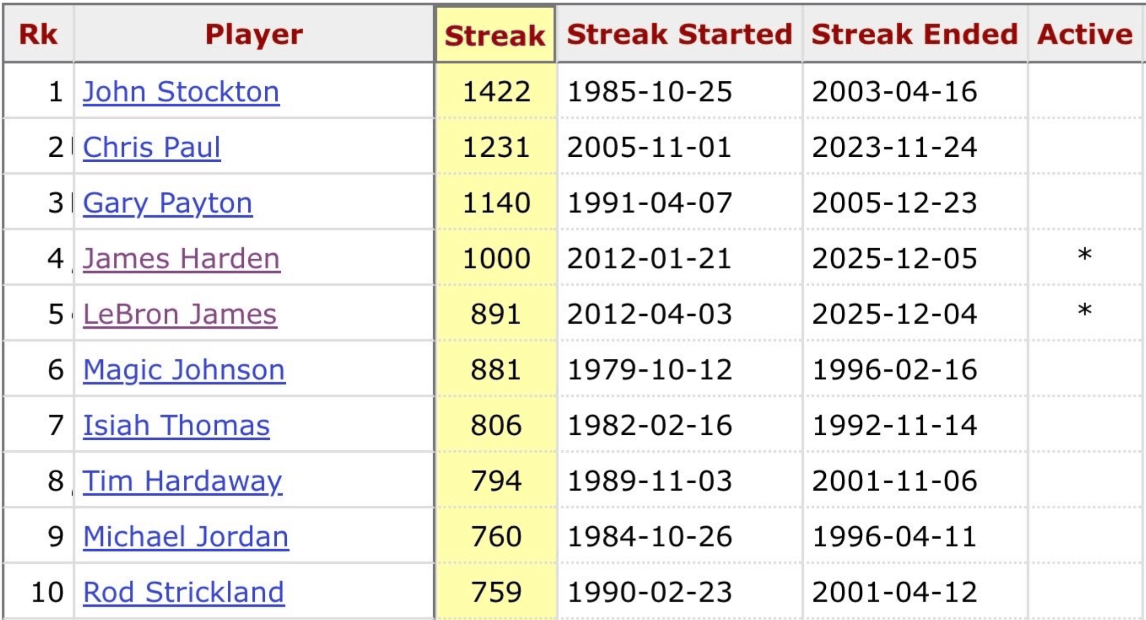 至此,哈登已经连续1000场常规赛至少送出1次助攻,他排在这项数据的历史第四,之前三位分别是约翰-斯托克顿(连续1422场)、克里斯-保罗(连续1231场)和加里-佩顿(连续1140场)。